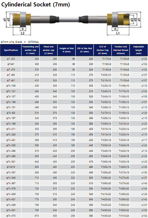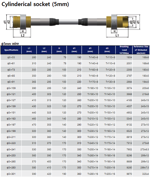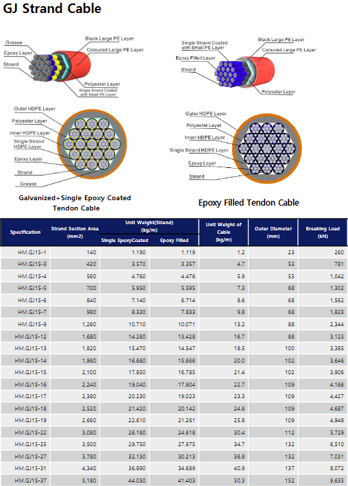 - - 꼬인 소선 케이블 곁면에 필라멘트 테이프를 씌우고 HDPE를 열처리하여 씌운 후 양끝에 Hot Casting, Cold Casting 소켓을 장착하고 선인장(Pre tension)단계를 거쳐 코일이나 드럼방식으로 포장하여 현장에 반입합니다.