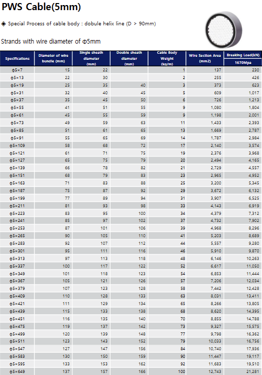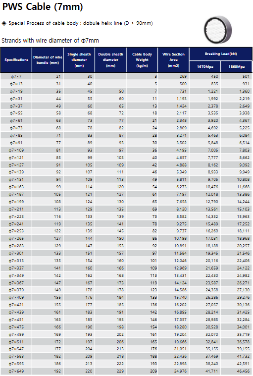 PWS(Parallel Wire Strand)는 주로 사장교 및 아치교의 주 케이블로 사용되는 공장 제작 케이블입니다. WS 제작방법은 용융도금된 5mm 또는 7mm 소선을 2~4°로 꼬으면서 Strand를 압출하여 제작합니다."